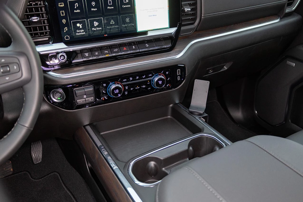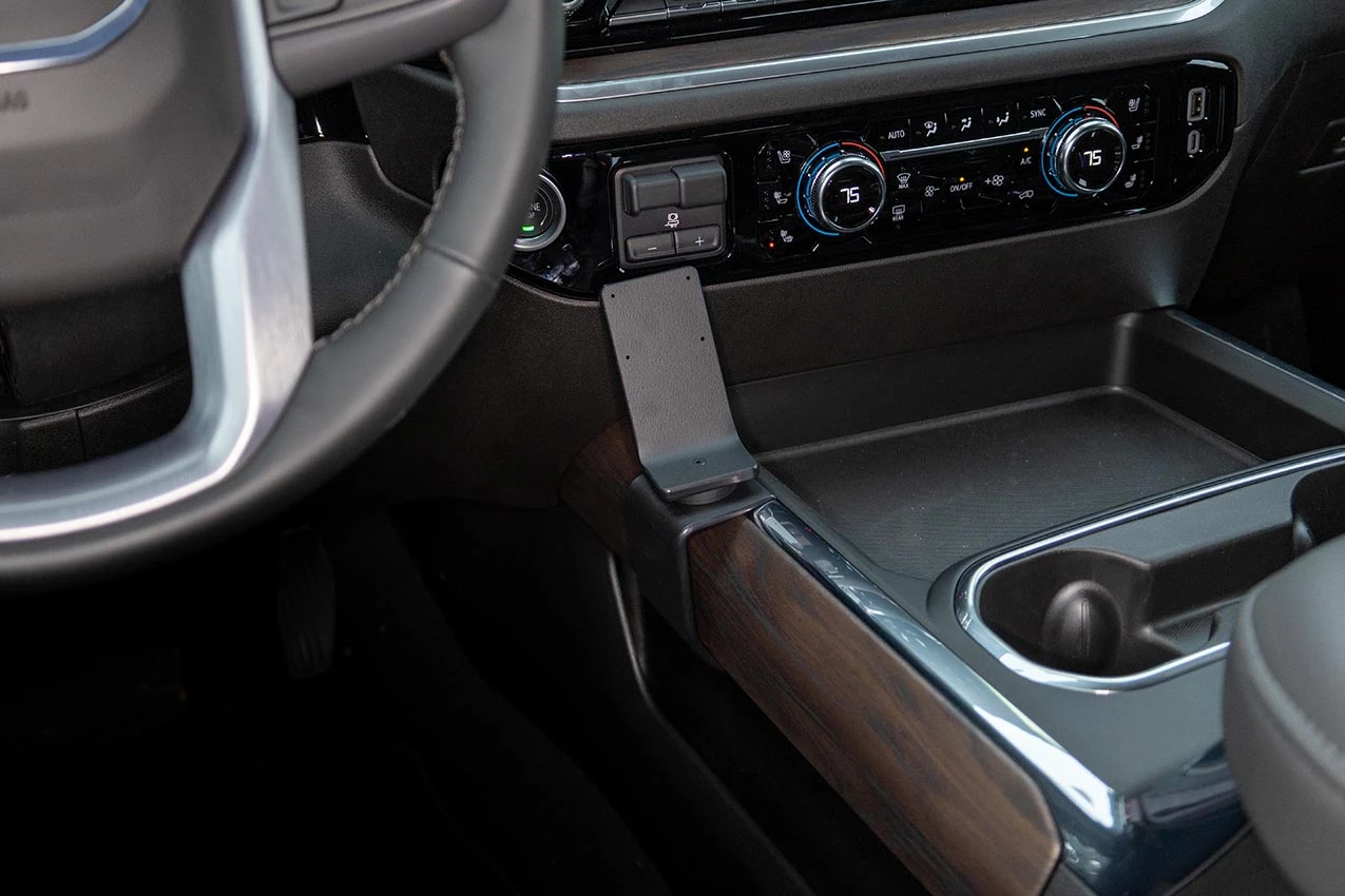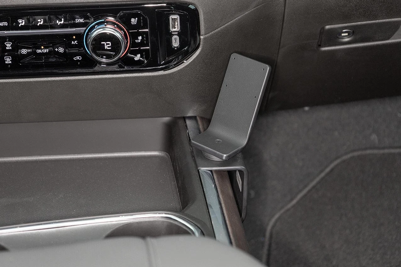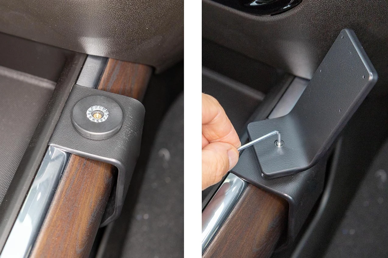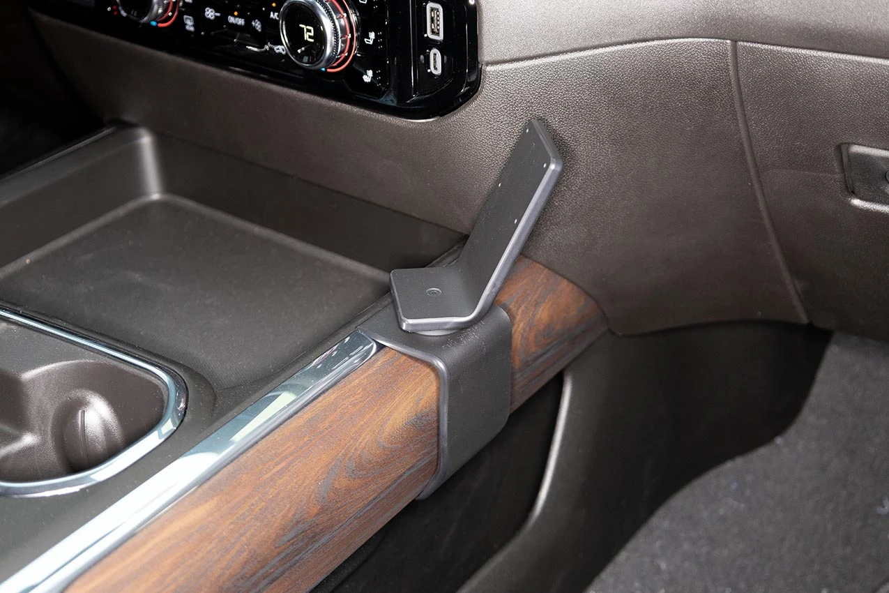 Press the thin end of the enclosed gap opener into the gap between the tray wall and the trim, to widen the gap. Use the included alcohol pad to clean the area where the mount will be installed. Peel off the adhesive tape cover. Hook/Press the lower edge of the mount into the gap in the console sidewall. Pull the top of the mount upwards and hook the angled edge into the gap next to the gap opener. Press down on top of the mount so the angled edge goes all the way into the gap. Pull out the gap opener.