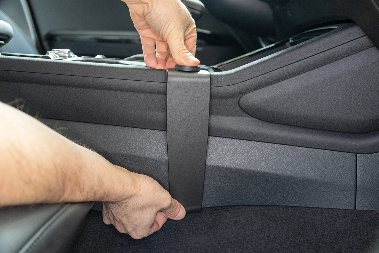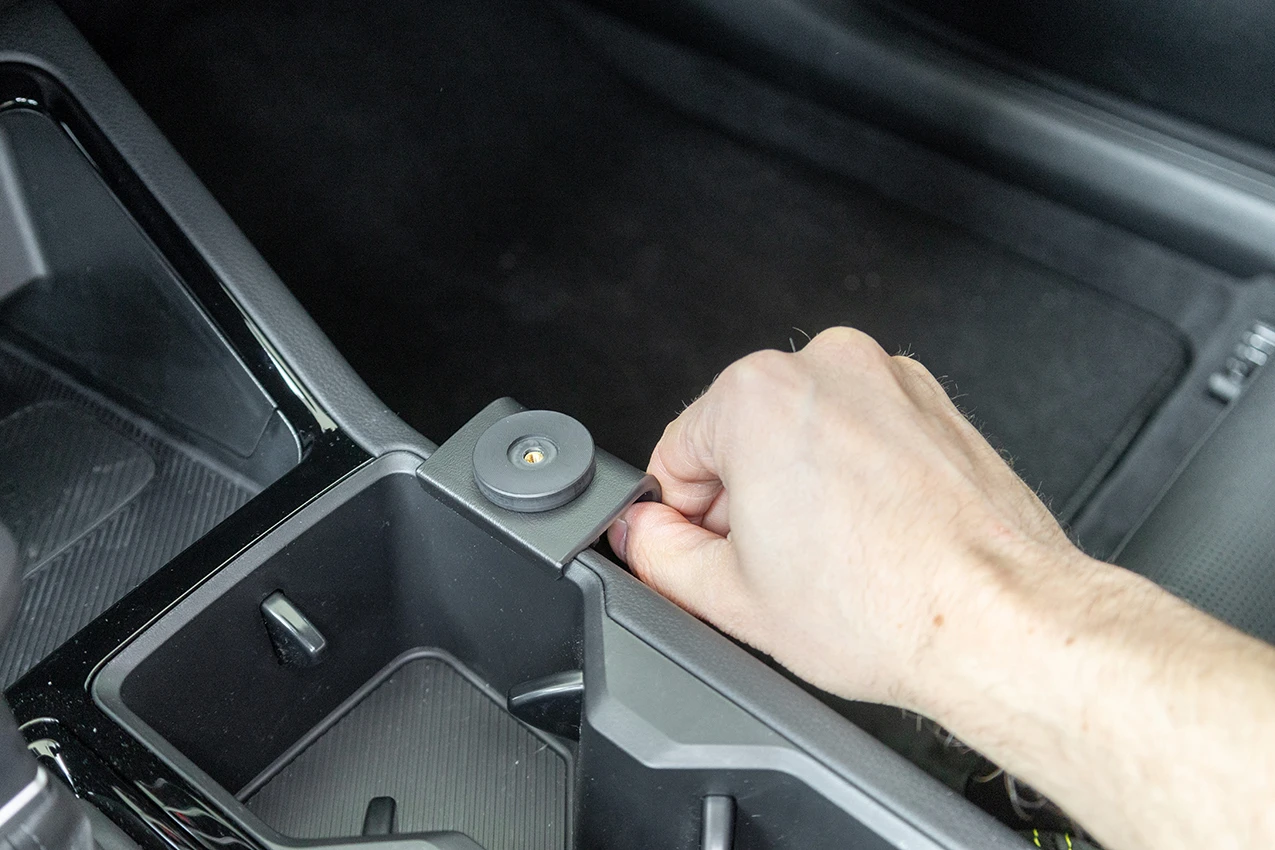 Gently pull the bottom of the console sidewall outwards. Press down on the top of the mount and hook the lower edge onto the bottom of the console.