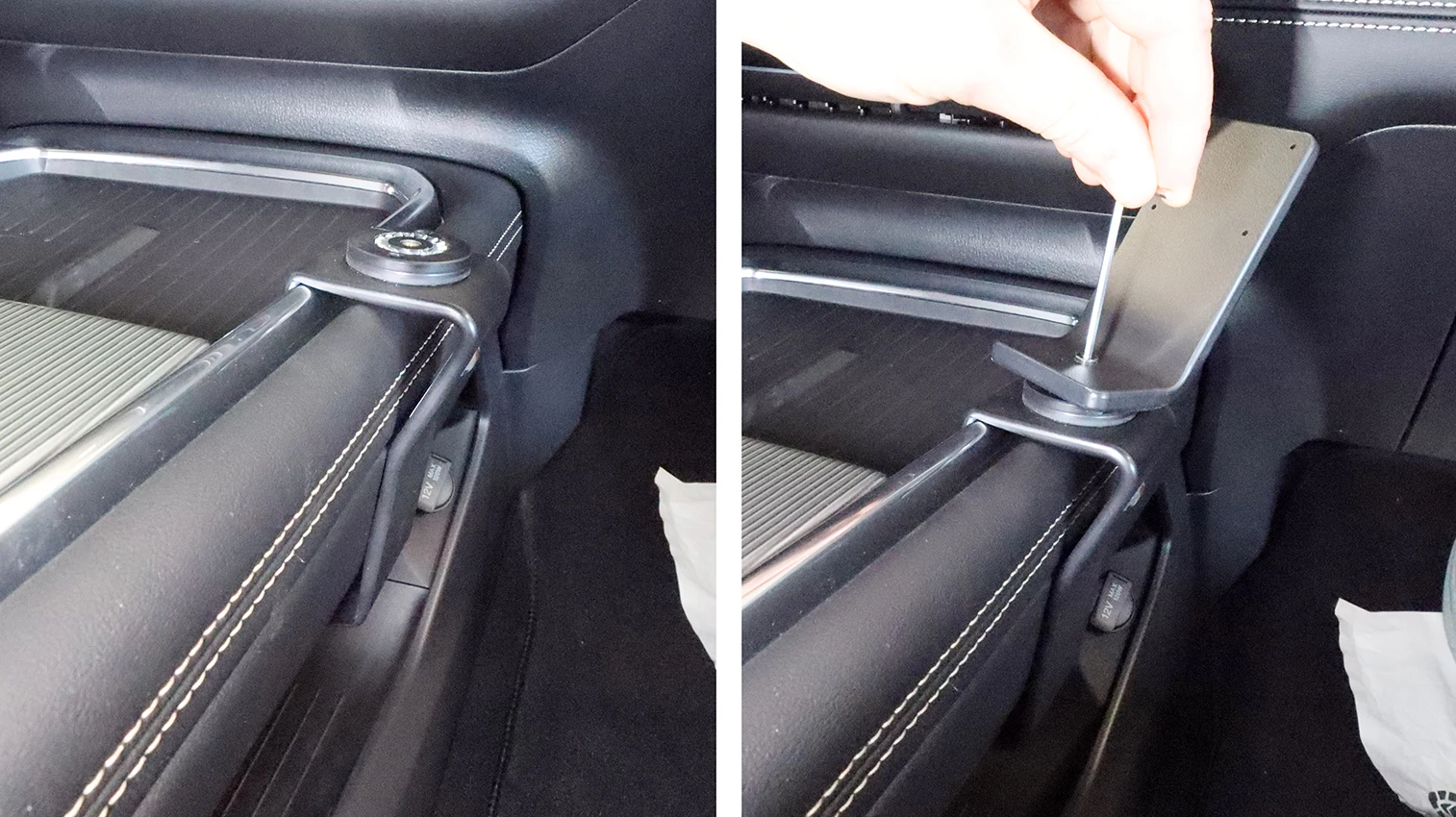 • 1. Use the enclosed alcohol pad to clean the area where the mount will be installed. Peel off the adhesive tape cover. Hook the lower edge of the mount under the edge of the console sidewall.