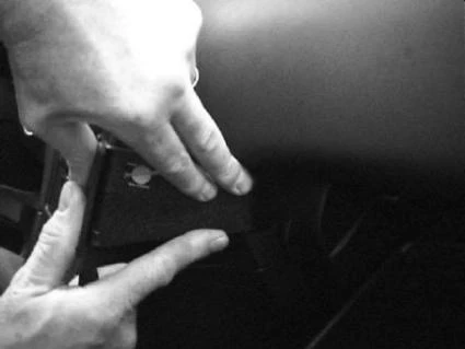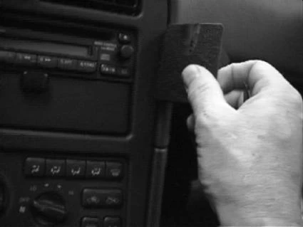 Press the curved edge on the left side of the ProClip, with adhesive tape, into the gap between the center console panel frame and the console edge.