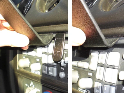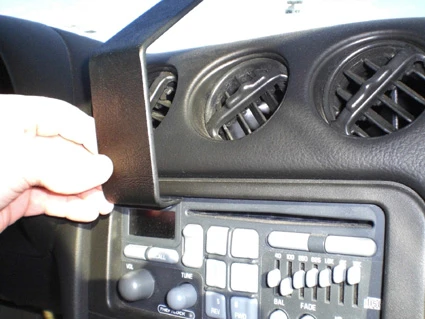 Use the enclosed alcohol pad to clean the area where the ProClip is to be installed. Press the thin end of the enclosed gap opener into the gap between the stereo and the surrounding panel frame, to widen the gap. Peel off the adhesive tape covers on the ProClip. Place the curved edge on the lower part of the ProClip towards the gap next to the gap opener. Press the curved edge firmly upwards so it snaps into the gap. The gap opener will drop from the gap as the curved edge is pressed into the gap.