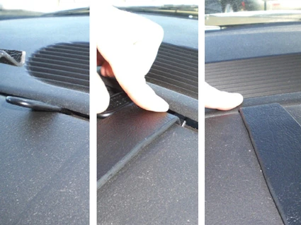 Press the gap opener in a 45 degrees angle into the gap on top of the dashboard, to widen the gap. Press down on the thick end of the gap opener so the gap in the dashboard panel opens wide. Press down on top of the ProClip so the curved edge hooks under the panel edge. Let go of the pressure on the gap opener and pull it out. Press down on top of the dashboard panel to make sure it is back into place.