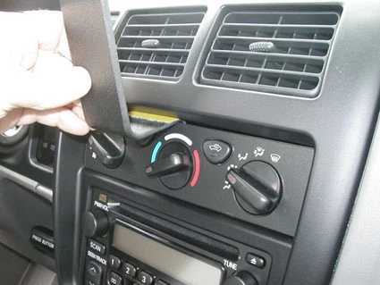 Flip the ProClip upwards and forward, towards the air vent, so the angled edge on the lower part of the ProClip hooks behind the climate control panel. NOTE: Do not push the lower part of the ProClip too far into the gap. If you do so it may not attach properly on top. The angled lip should be positioned right behind the climate control panel.