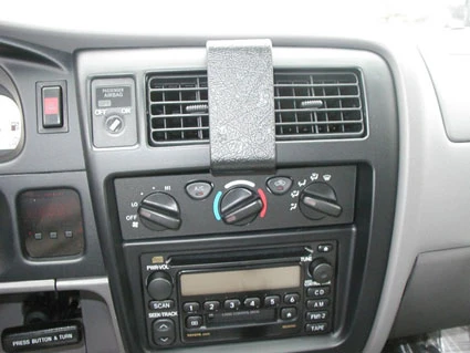 (Not Shown in photo) Insert the included gap opener into the gap between the air vent panel frame and the padded dashboard where the upper angled edge of the ProClip will attach, to widen the gap. Press firmly forward on the upper part of the ProClip so the grooved edge goes into the gap between the air vent panel frame and the padded dashboard. Press until you see or hear/feel it click into place. Remove the gap opener.