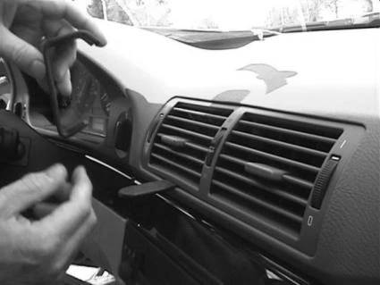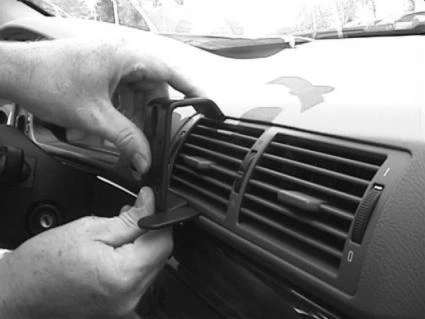 Press the enclosed gap opener into the gap between the air vent frame and the padded dashboard at pos.1. to widen gap.