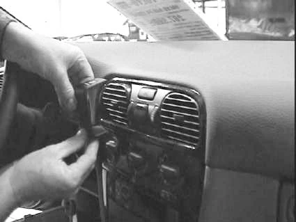 Hook the angled edge on the upper part of the ProClip into the gap between the air vent frame and the dashboard at pos. 2. Note: If any of the gaps is too tight, press the thin end of the enclosed gap opener into the gap to widen the gap.