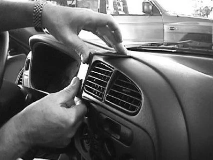 Press the grooved edge on the lower part of the ProClip into the gap between the air vent panel frame and the center dash panel frame. Press until you see or hear/feel it snaps into place. If the gap is very tight press the thin end of the enclosed gap opener into the gap next to the ProClip to widen the gap
