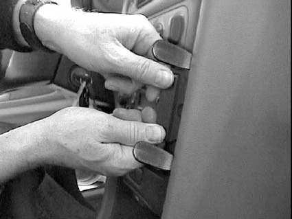 Clean the surface between the control panel and the dashboard with the enclosed alcohol pad. Press the thin ends of the enclosed gap openers into the gap between the control panel and the dashboard, to widen the gap. Place the gap openers about 10 cm apart. Press Part 1 into the gap between the gap openers.
