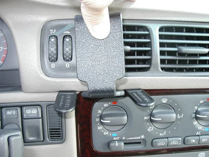 Press the grooved edge on the upper part of the ProClip into the gap between the air vent frame and the padded dashboard. Press until you see or hear/feel it snaps into place. (Note: if the gap is very tight, press the thin end of the two enclosed gap openers into the gap, one on each side of the ProClip, to widen the gap. Then press the ProClip into the gap)