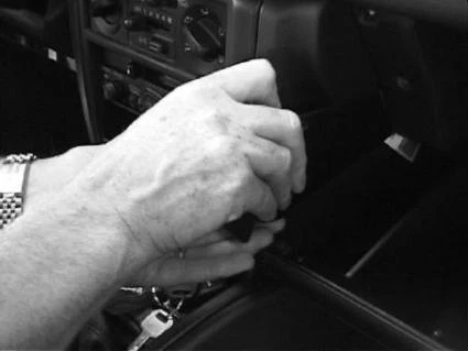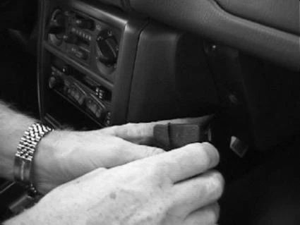 Press/hook the angled edge on the right side of the ProClip into the gap between the dashboard and the glove compartment frame and flip the ProClip to the left so the angled edge hooks behind the glove compartment frame.