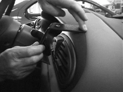 Press the grooved edge on the lower part of the ProClip into the gap between the air vent panel frame and the padded part of the dashboard. Press until you see or hear/feel it snaps into place.