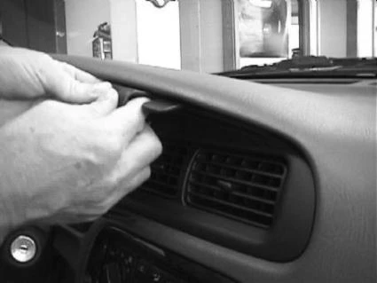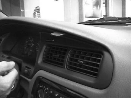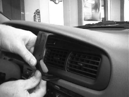 Press the thin end of the enclosed gap opener into the gap between the air vent panel frame and the dashboard ledge to widen the gap. Press the grooved edge on the lower part of the ProClip into the gap next to the gap opener. Press until you see or hear/feel it snaps into place. Pull out the gap opener.