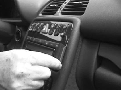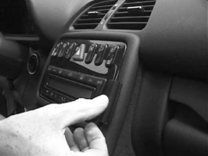Push forward on the right side of Part 1. towards the padded console edge, so the angled edge of Part 1. hooks under/behind the panel frame and the adhesive sticks to the console edge.