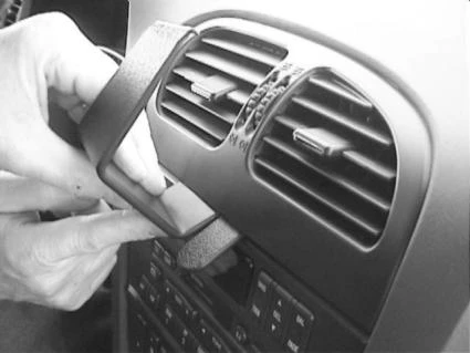 Press forward on the upper part of the ProClip and at the same time: press downwards on the top so the angled edge snaps into place between the air vent panel frame and the padded dashboard.