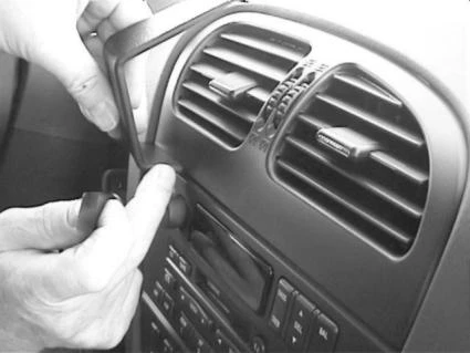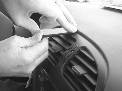 Press the enclosed gap opener into the gap between the air vent panel frame and the stereo to widen the gap. Press the curved edge on the lower part of the ProClip into the gap next to the gap opener. Pull out the gap opener.