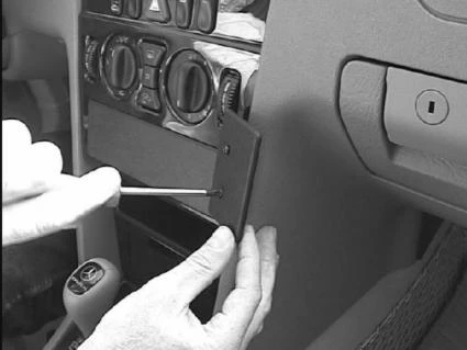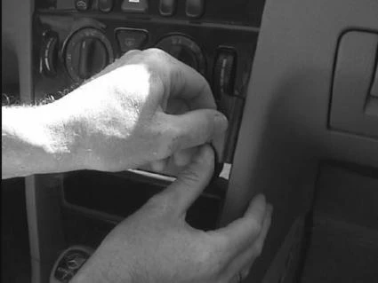 Press the fixing piece into the gap between the control panel and the dashboard. Press on the top of the piece, away from the steering wheel, so the adhesive tape attaches.