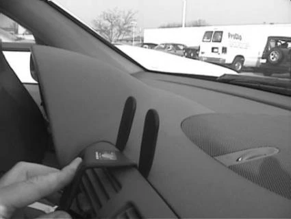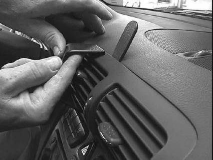 Press the thin end of both the gap openers into the gap between the padded dashboard and the air vent frame (on each side of the ProClip) to widen the gap.