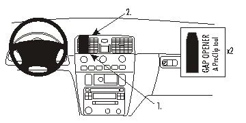 Press the gap opener into the gap between the dashboard and the frame surrounding the air vents. Hook the upper part of the ProClip, with angle, into the gap next to the gap opener.