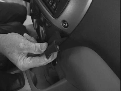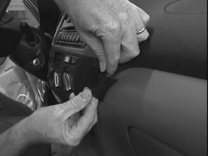 Push Part 1 away from the steering wheel, so the angled edge hooks under/behind the console frame and the adhesive tape sticks to the dashboard.