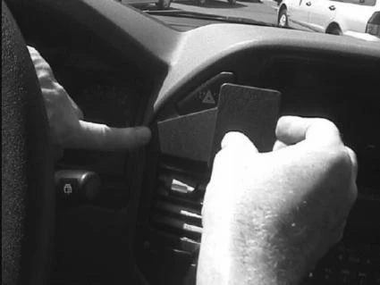 Peel off both adhesive tape covers on the ProClip. Press the right part of the ProClip into the gap between the navigation system and the surrounding frame.