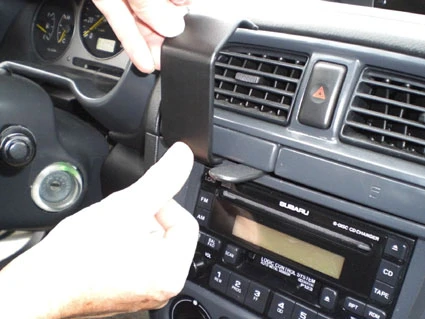 Press the thin end of the enclosed gap opener into the gap between the panel section below the air vent and the panel frame surrounding the stereo, to widen it. Peel off the cover of adhesive tape on the ProClip.