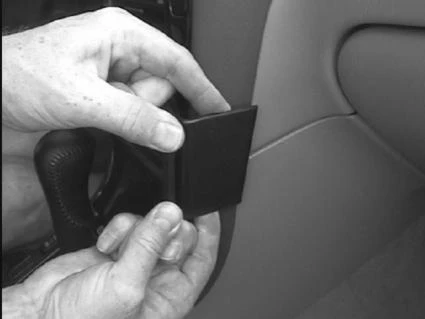 Press the thin end of the enclosed gap opener into the gap between the frame surrounding the stereo and the control panel to widen the gap. Peel off the cover of the adhesive tape on the ProClip