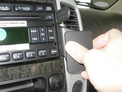 Press the thin end of the enclosed gap opener into the gap between the stereo and the surrounding panel frame, to widen the gap. Peel off the cover of adhesive tape on the ProClip. Press the grooved edge on the left side of the ProClip into the gap below the gap opener. Press until you see or hear/feel it snaps into place. Pull out the gap opener.