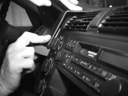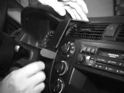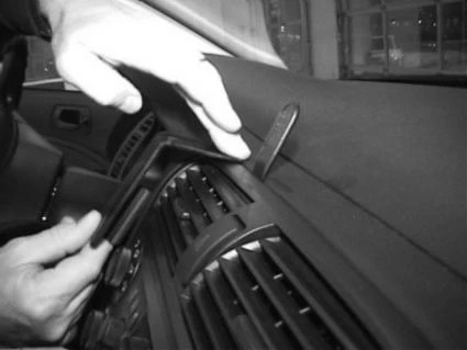 Press the thin end of the enclosed gap opener into the gap between the padded dashboard and the air vent panel frame to widen the gap. Peel off the cover of the adhesive tape on the ProClip. Press the angled edge on the upper part of the ProClip into the gap next to the gap opener. Adjust the ProClip so the vertical part on the lower part of the ProClip is positioned over the gap between the climate control and the padded dashboard edge. Pull out the gap opener.