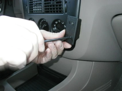 Press a screwdriver (Philips) firmly through the predrilled holes in Part 2 to open them up. Peel off the cover of the adhesive tape on Part 2. Place Part 2 onto Part 1 so the holes match and the adhesive tape on Part 2 is on the left side attaching to the center dashboard panel. Screw Part 2 onto Part 1 using the enclosed screws. NOTE: DON'T SCREW THE SCREWS INTO PART1 IN AN ANGLED POSITION BASED ON THE ANGLE OF PART 2, BUT STRAIGHT INTO PART 1.