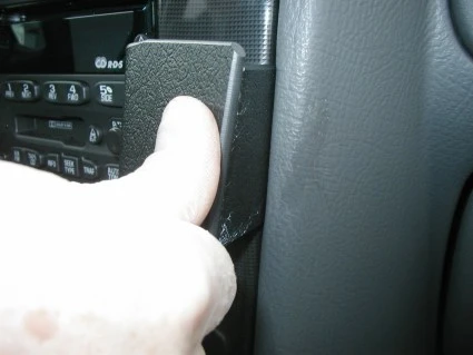 Press the curved edge on the left side of the ProClip into the gap between the stereo and the surrounding panel frame. Press until you see or hear/feel it snaps into place.