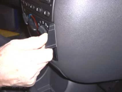 Press to the right on Part 1, away from the steering wheel, so the angled edge hooks behind the control panel and the adhesive tape attaches on the dashboard.