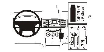 Peel off the cover of the adhesive tape on Part 1. Press Part 1 into the gap between the gap openers. Press to the right on Part 1, away from the steering wheel, so the angled edge hooks under/behind the control panel and the adhesive attaches to the dashboard. Pull out the gap openers.