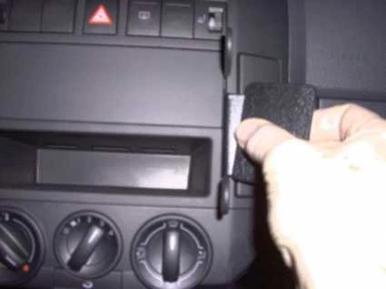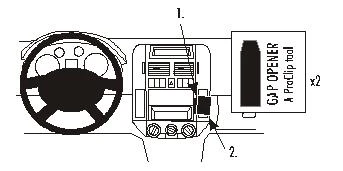 Press the thin end of the enclosed gap openers into the gap between the stereo/coin shelf and the surrounding frame to widen the gap. Peel off the adhesive tape covers on the ProClip. Press the left part of the ProClip into the gap between the gap openers
