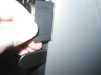 Peel off the cover of the adhesive tape on Part 1. Press Part 1 into the gap, between the gap openers. Press Part 1 to the right, away from the steering wheel, so the angled edge hooks behing the control panel and the adhesive attaches to the dashboard. Pull out the gap openers.