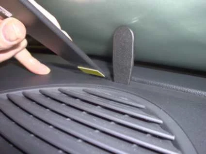 Press the thin end of the enclosed gap opener into the gap in the dashboard above the air vent to widen the gap. Peel off the cover of the adhesive tape on the ProClip. Press the angled edge of the upper part of the ProClip into the gap next to the gap opener.