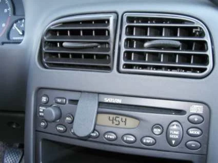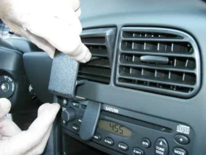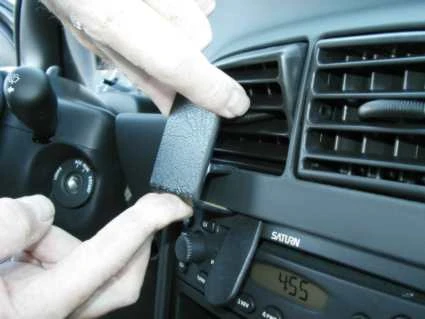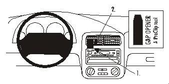 Adjust the air vent so the air flow is pointing downwards. Press the thin end of the enclosed gap opener into the gap between the stereo and the surrounding panel frame, to widen it. Peel off the cover of the adhesive tape on the ProClip.