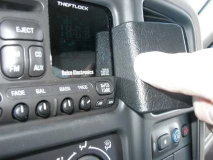 Place your hand on the right side of the faceplate and your thumb on to the left side of the faceplate. At the same time: Press the ProClip firmly to the right, towards the steering wheel, and forward, towards the stereo, so the angled edge on the left side of the ProClip snaps into the gap between the stereo and the surrounding panel frame.