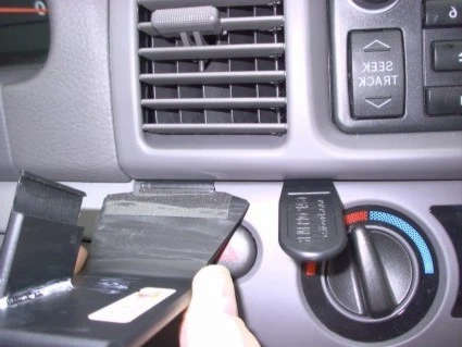 Press the thin end of the enclosed gap opener into the gap between the air vent panel frame and the climate control panel frame, to widen the gap. Press the curved edge on the lower part of the ProClip into the gap next to the gap opener.