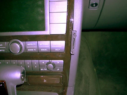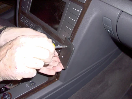 Press the thin end of the enclosed gap opener into the gap between the control panel and the dashboard to widen the gap. Peel off the cover of the adhesive tape on Part 1. Press Part 1 into the gap below the gap opener.