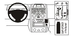 Peel off the cover of the adhesive tape on Part 1. Press Part 1 into the gap above the gap opener. Press Part 1 rightwards, away from the steering wheel, so the angled edge hooks behind the control panel and the adhesive attaches to the dashboard. Pull out the gap opener.