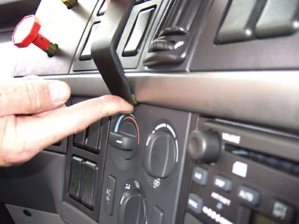 Press the thin end of the enclosed gap opener into the gap between the center console panel frame and the dashboard edge, to widen the gap. Peel off the cover of adhesive tape on the ProClip.