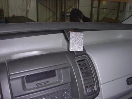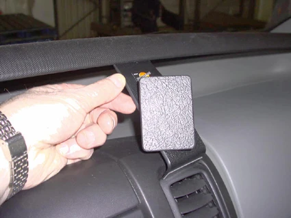 Peel off the cover of the adhesive tape on the ProClip. Place the ProClip to the left of the left air vent, on the right side of the steering wheel. Hold the ProClip so the upper part is pointing towards you. Press the curved edge on the upper part of the ProClip upwards/towards you into the gap in the dashboard, under the dashboard ledge. Pull the lower part of the ProClip towards you, away from the dashboard, so the curved upper edge hooks into the gap.