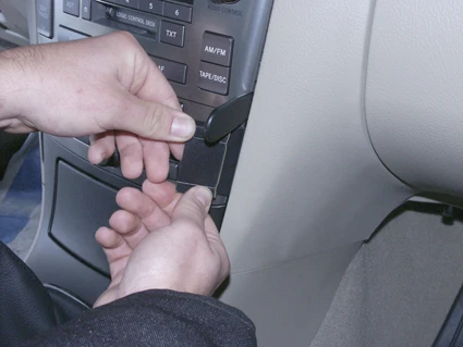 Press forwards and o the right on Part 1, away from the steering wheel, so the angled edge hooks behind the control panel and the adhesive tape attaches to the dashboard. Pull out the gap opener.