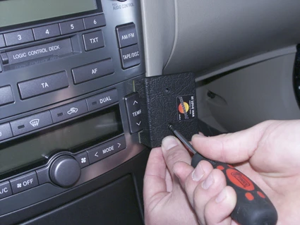 Press the thin end of the enclosed gap opener into the gap between the control panel and the dashboard to widen the gap. Peel off the cover of the adhesive tape on Part 1. Press the angled edge on Part 1 into the gap below the gap opener.