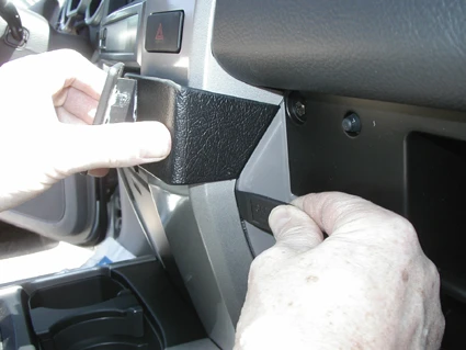 Open the glove compartment door. Peel off the cover of adhesive tape on the ProClip. Place the curved edge on the left side of the ProClip towards the gap between the climate control panel and the center console edge.