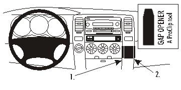 Press the thin end of the enclosed gap opener into the gap in the center console sidewall, to widen it. At the same time: press firmly forward on the right side of the ProClip so the angled edge goes into the gap above the gap opener. Press until you see or hear/feel it snaps into place. Close the glove compartment door.