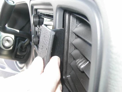 Peel off the cover of the adhesive tape on the ProClip. Press/hook the angled edge on the right side of the ProClip into the gap between the air vent and the surrounding panel frame.