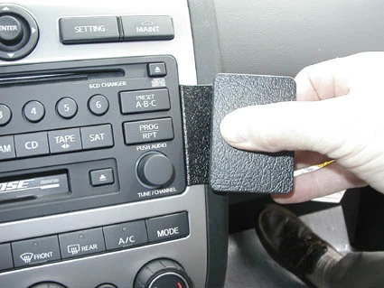 Place your fingers on the right side of the ProClip and press the ProClip towards the stereo so the angled edge on the left side of the ProClip snaps into the gap between the stereo and the surrounding panel frame. Press forward on the right side of the ProClip to make sure the angled edge is all the way into the gap.
