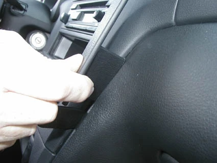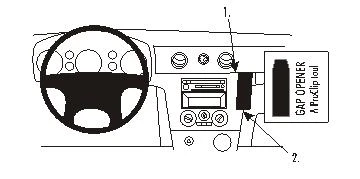 Press the angled edge on the upper part of the ProClip into the gap between the padded dashboard ledge and the panel frame, and at the same time: flip the lower part of the ProClip down, towards the gap opener, so the angled edge on the upper part of the ProClip hooks behind the panel frame.