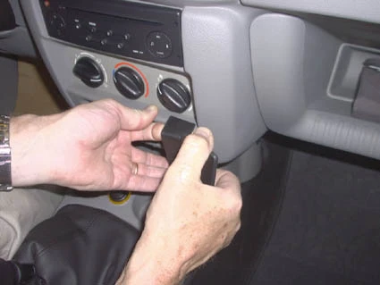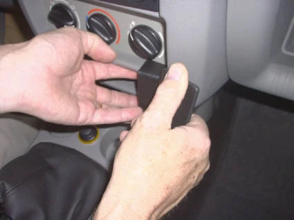 Hook/Press the angled edge on the upper part of the ProClip into the gap between the climat control panel and the surrounding frame.